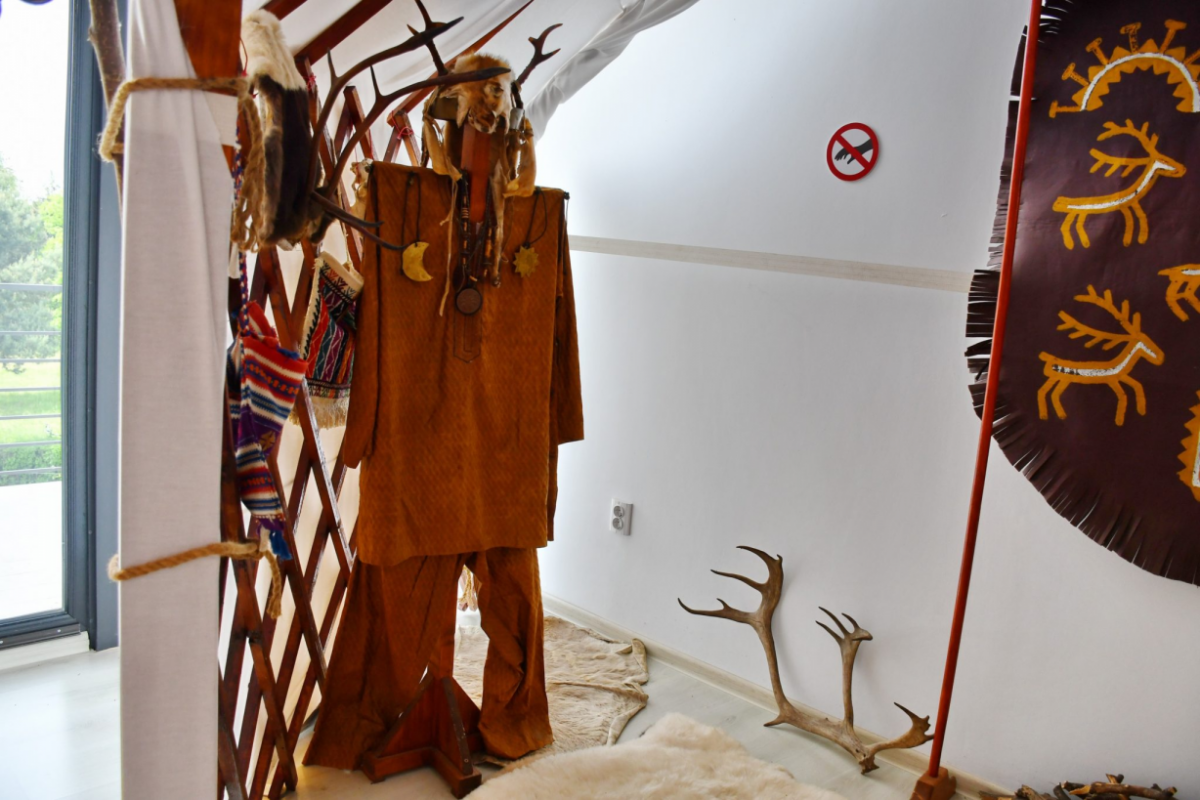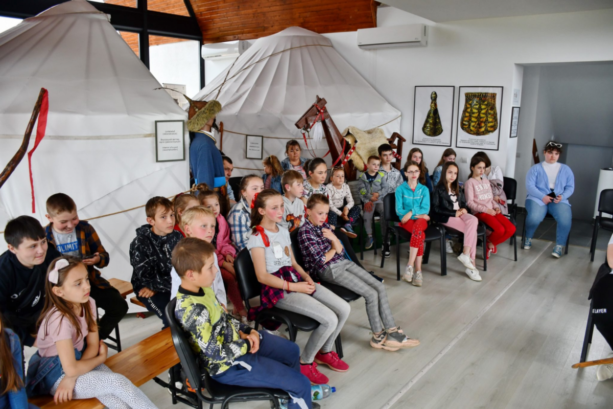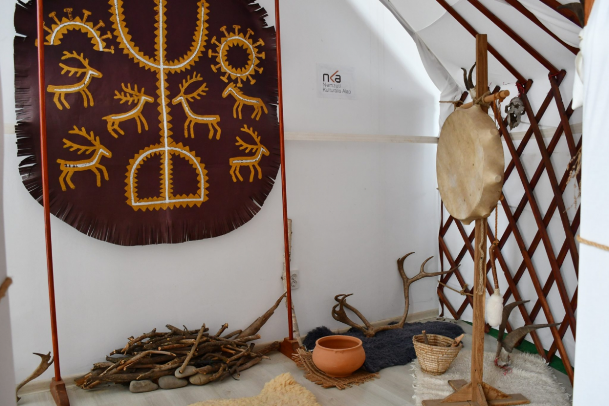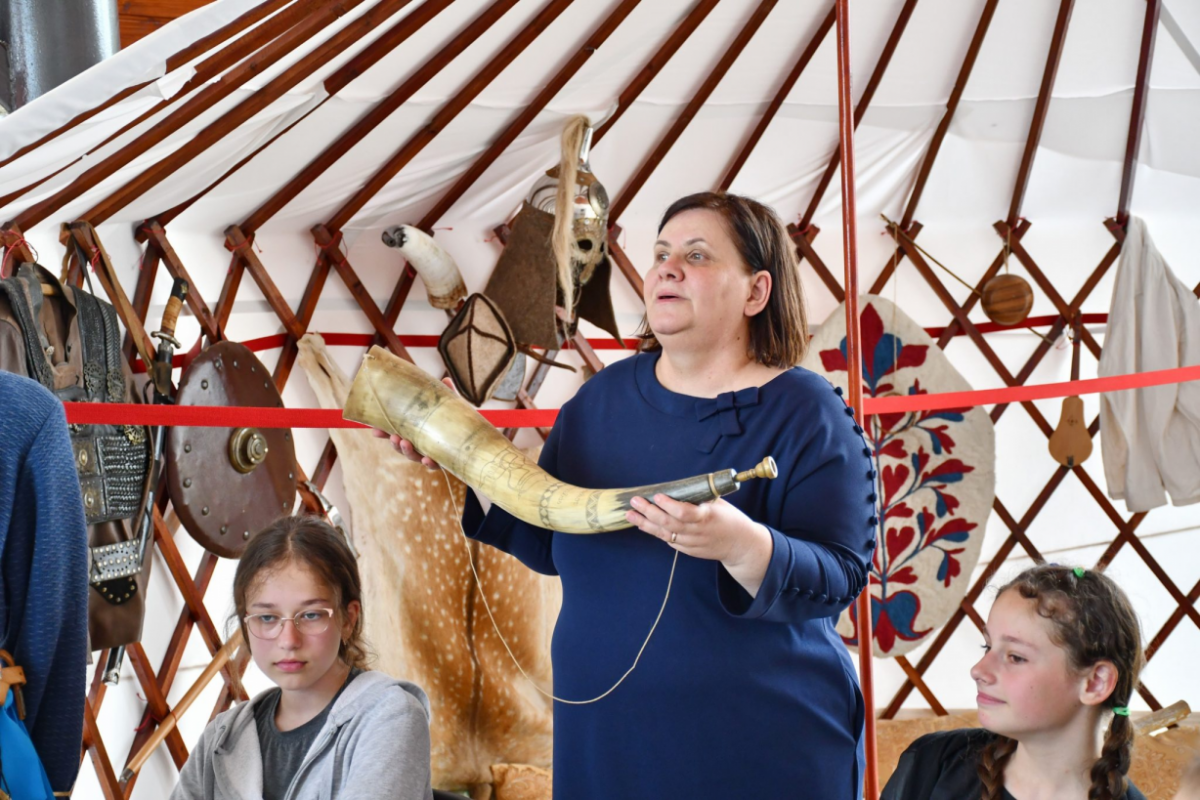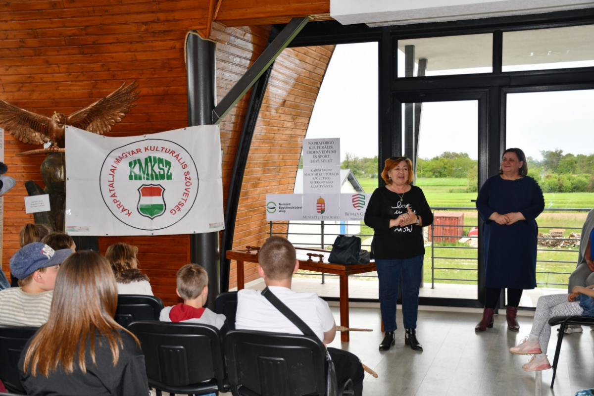 Групи, які прибули з сілЧома, Геча, Бадалово, Мужієво та Бене почергово брали участь у екскурсіях з інтервалом у півгодини, в рамках яких етнограф КейсМаргарита, викладачкаЗакарпатського угорського інституту імені Ференца Ракоці ІІ ознайомила відвідувачів із виставкою, яка складається з багатьох елементів, та запросила присутніх у віртуальну подорож. В особливо цікавій для дітей формі вона розповіла про побут, одяг, бойові звичаї та вірування угорців-основоположників Батьківщини, про талтошів, представила облаштовану в експозиції юрту та знаряддя праці в ній. У презентації «Побут та вірування угорців-основоположників Батьківщини» школярі залучалися до пригадування легенд про походження угорців – легенди про тотемну тварину птаха турула та легенди про чудодійного оленя, пов’язаного з історія про Хунора та Магора, легенди про ріг Лехеля, а також героїчні оповіді, пов’язані зі Світовим Деревом – або Деревом Життя.